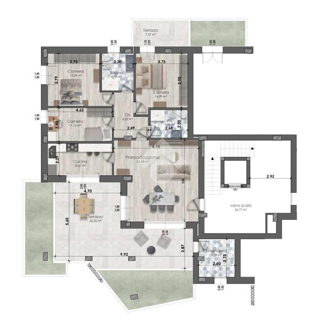 La zona giorno è progettata per essere il fulcro della casa, dalla quale si accede al terrazzo che abbraccia la zona giorno.