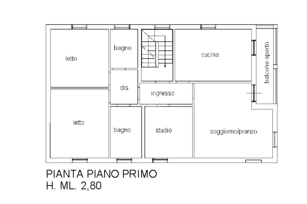 Al piano primo: QUADRILOCALE composto da ingresso con soggiorno, cucina abitabile, balcone, due camere matrimoniali, una camera singola e due bagni.